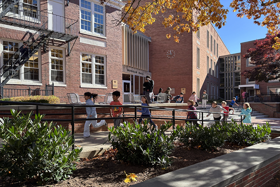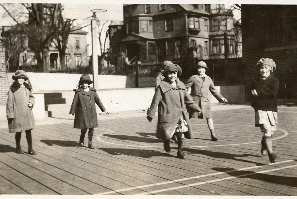 When Bob Martin P’05, P’10 first came across the black-and-white photograph that would inspire this year’s holiday card, he was caught, he says, by a single step suspended in mid-air. The image shows a group of Wheeler students in stride, as they run in the space that’s now between Hope Building and the Fresh Air Building on our Providence campus. Baker House, looking much the same as it does today, appears in the background. Closer to the lens, one girl on the right appears to hover, her feet lifted just off the ground. She’s been frozen in a leap that spanned a century when it finally prompted Mr. Martin to pause while he was sorting through old Wheeler photos.